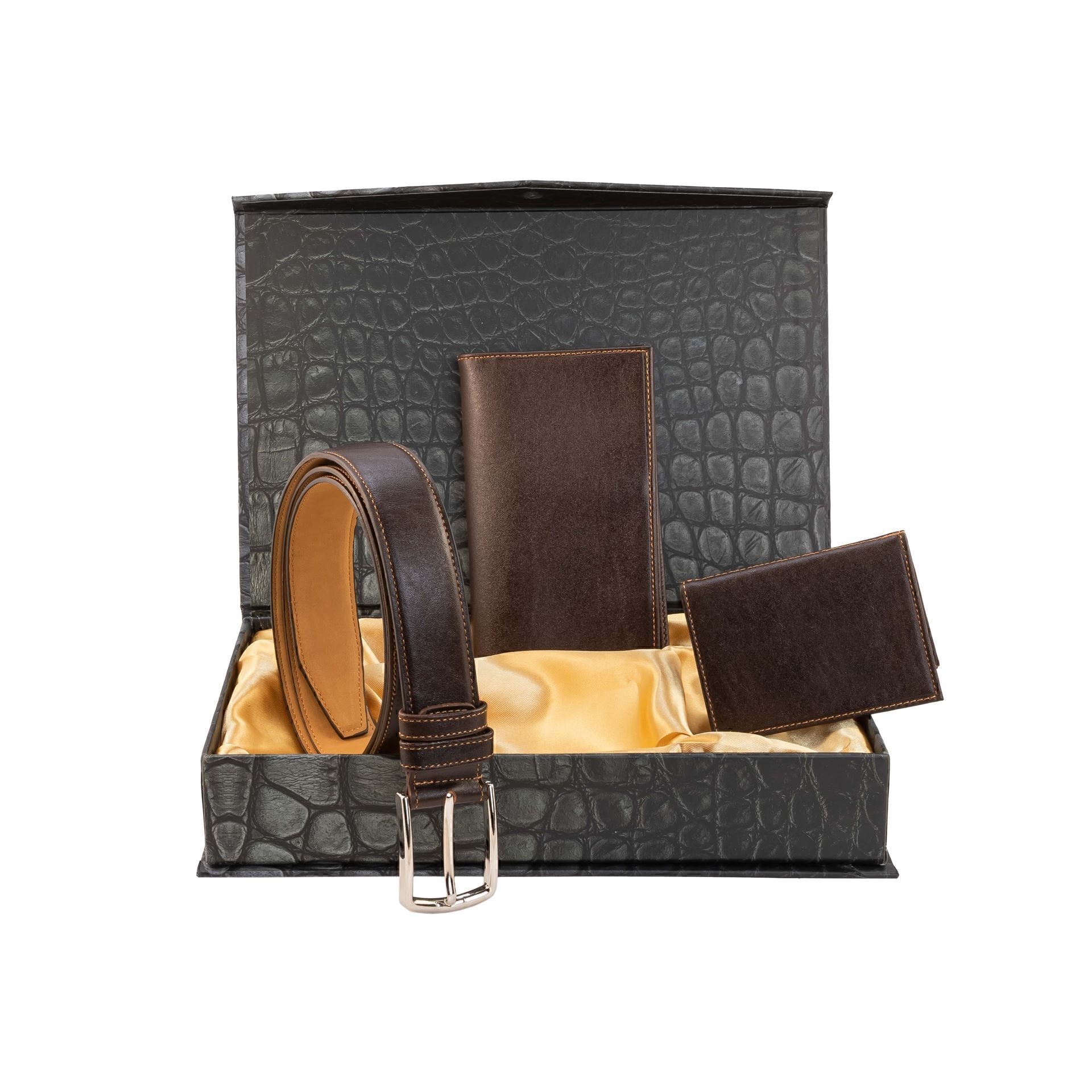 ست سه تکه چرم شیما Al 18 شامل یک کیف پول ، یک کمربند کلاسیک مردانه و یک جا کلیدی می باشد،دارای یک جعبه شیک مناسب برای هدیه می باشد. کیف پول شامل یک محفظه جهت قرار دادن موبایل تا 6.5 اینچ، 5 جای کارت اعتباری و یک جیب تلق دار جهت قرار دادن کارت شناسایی می باشد. جاکلیدی حلقه ای با یراق آلات شیک و با کیفیت است.